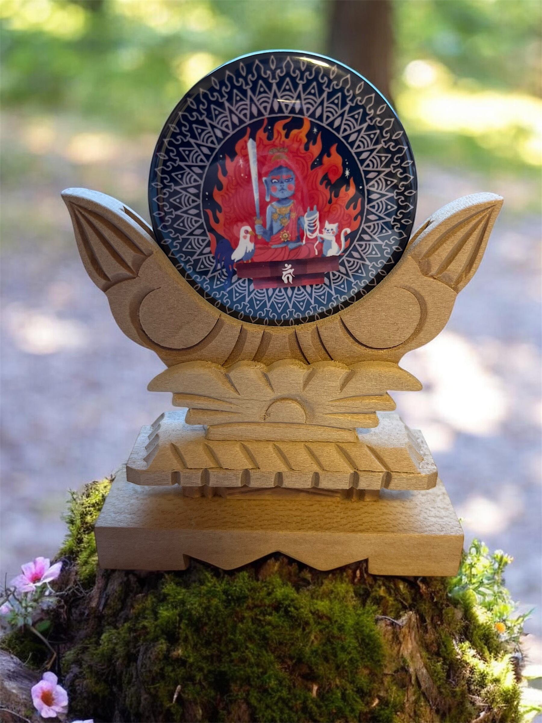 祈りを込めた御守り本尊ミラー|不動明王さま。力強く描かれた不動明王さまが、あなたのこころに光を灯します。この57mmのミラーは、手のひらに収まるサイズながら、深いメッセージを持つデザイン。不動明王さまは、揺るぎない意志と煩悩を断ち切る力を象徴し、心を整える時間に、ともにある存在です。酉年生まれの守り本尊として、生涯そっと寄り添ってくださいます。この小さな作品が、あなたのこころに光を灯します。